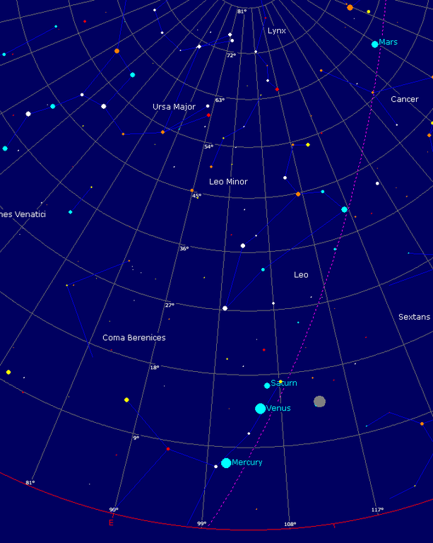 Merkur, Venus, Saturn, Mars und Mond sind in einer Reihe am Morgenhimmel (kurz vor Sonnenaufgang) sichtbar.